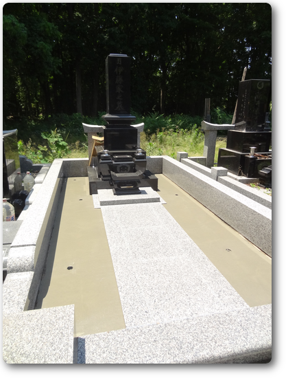 北本市内の共同墓地でお墓の中に樹脂舗装を施す工事を行っています